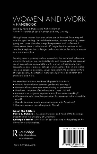 Focuses on vital contemporary issues Women in the work force today are still subjected to the "glass ceiling," sexual discrimination, income inequality, stereotyping, and other obstacles to equal employment and professional advancement. Now a collection of 150 original articles written for this handbook explores the challenges and career blocks that today's women face in the workplace, discuss important contemporary issues, and offers a wide range of facts and data on women's employment. Offers insights and information The "Handbook" answer hundreds of questions as it illuminates current achievements and obstacles to success for women in the marketplace. Drawing upon a growing body of research in the social and behavioral sciences, the articles provide insights into such issues as the sex segregation of occupations, comparable worth, women in traditionally male occupations, career plans of college women, gende4r bias in job evaluations and personnel decisions, sexual harassment, the gendered culture of organizations, the effects of maternal employment on children and child care, and more. The articles draw on extensive research and studies on women in the workplace across the U.S. and around the world. A valuable research aid This handbook presents the reader with a broadly-based understanding of women's work experiences and provides a useful set of sources for in depth research. It is a valuable reference for professors, librarians, researchers, guidance counselors, and students who need reliable, up-to-date information. The handbook includes a subject and name index.