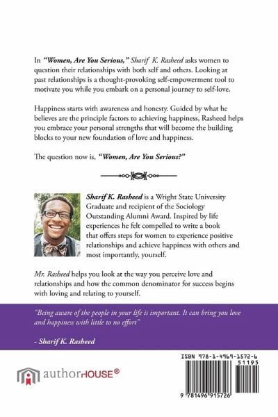 In ¿Women, Are You Serious,¿ Sharif K. Rasheed asks women to question their relationships with both self and others. Looking at past relationships is a thought-provoking self-empowerment tool to motivate you while you embark on a personal journey to self-love. Happiness starts with awareness and honesty. Guided by what he believes are the principle factors to achieving happiness, Rasheed helps you embrace your personal strengths that will become the building blocks to your new foundation of love and happiness. The question now is, ¿Women, Are You Serious?¿