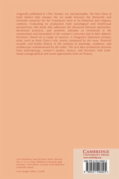 Women, Art, and Spirituality: The Poor Clares of Early Modern Italy situates the art made between the thirteenth and sixteenth centuries for the Franciscan nuns in its historical and religious contexts. Evaluating its production from sociological and intellectual perspectives, this study also addresses the discourse between spirituality, devotional practices, and aesthetic attitudes as formalized in the construction and decoration of the women's convents and in their didactic literature. Based on a range of sources, it integrates important primary texts, such as Saint Clare's rule, poetry composed by the nuns, financial records, and family history in analysis of paintings, sculpture, and architecture commissioned by the order. Also synthesized in this ground-breaking study are recent theoretical developments in anthropology, women's studies, history, and literature with traditional iconographical and social approaches of art history.