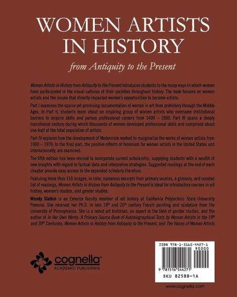 Women Artists in History from Antiquity to the Present introduces students to the many ways in which women have participated in the visual cultures of their societies throughout history. The book focuses on women artists and the issues that directly impacted women’s opportunities to become artists. Part I examines the sparse yet promising documentation of women in art from prehistory through the Middle Ages. In Part II, students learn about an inspiring group of women artists who overcame institutional barriers to acquire skills and pursue professional careers from 1400 – 1800. Part III spans a deeply transitional century during which thousands of women developed professional skills and comprised about one-half of the total population of artists. Part IV explores how the development of Modernism worked to marginalize the works of women artists from 1900 – 1970. In the final part, the positive effects of feminism for women artists in the United States and internationally, are examined. The fifth edition has been revised to incorporate current scholarship, supplying students with a wealth of new insights with regard to factual data and interpretive strategies. Suggested readings at the end of each chapter provide easy access to the expanded scholarly literature. Featuring more than 110 images, in color, numerous excerpts from primary sources, a glossary, and curated list of readings, Women Artists in History from Antiquity to the Present is ideal for introductory courses in art history, women’s studies, and gender studies. Wendy Slatkin is an emerita faculty member of art history at California Polytechnic State University, Pomona. She received her Ph.D. in late 19th and 20th century French painting and sculpture from the University of Pennsylvania. She is a noted art historian, an expert in the field of gender studies, and the author of In Her Own Words: A Primary Source Book of Autobiographical Texts by Women Artists in the 19th and 20th Centuries, Women Artists in History from Antiquity to the Present, and The Voices of Women Artists.