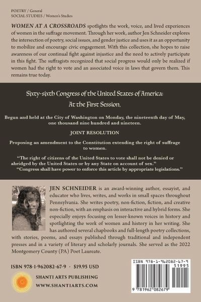 Women at a Crossroads spotlights the work, voice, and lived experiences of women in the suffrage movement. Through her work, author Jen Schneider explores the intersection of poetry, social issues, and gender justice and uses it as an opportunity to mobilize and encourage civic engagement. With this collection, she hopes to raise awareness of our continual fight against injustice and the need to actively participate in this fight. The suffragists recognized that social progress would only be realized if women had the right to vote and an associated voice in laws that govern them. This remains true today. It is critically important to find new ways to connect with diverse communities in the fight against injustice, and this book is designed to aid in this mission, with poetry and poetic verse seen as a tool to connect with local youth, young adults, and readers of all ages in schools, readings, workshops, and other appropriate settings.