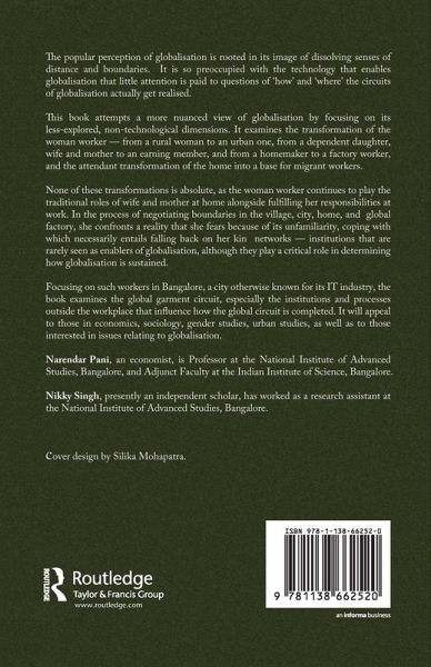 The popular perception of globalisation is rooted in its image of dissolving senses of distance and boundaries. It is so preoccupied with the technology that enables globalisation that little attention is paid to questions of 'how' and 'where' the circuits of globalisation actually get realised.¿ This book attempts a more nuanced view of globalisation by focusing on its less-explored, non-technological dimensions. It examines the transformation of the woman worker - from a rural woman to an urban one, from a dependent daughter, wife and mother to an earning member, and from a homemaker to a factory worker, and the attendant transformation of the home into a base for migrant workers. None of these transformations is absolute, as the woman worker continues to play the traditional roles of wife and mother at home alongside fulfilling her responsibilities at work. In the process of negotiating boundaries in the village, city, home, and global factory, she confronts a reality that she fears because of its unfamiliarity, coping with which necessarily entails falling back on her kin networks - institutions that are rarely seen as enablers of globalisation, although they play a critical role in determining how globalisation is sustained. Focusing on such workers in Bangalore, a city otherwise known for its IT industry, the book examines the global garment circuit, especially the institutions and processes outside the workplace that influence how the global circuit is completed. It will appeal to those in economics, sociology, gender studies, urban studies, as well as to those interested in issues relating to globalisation.
