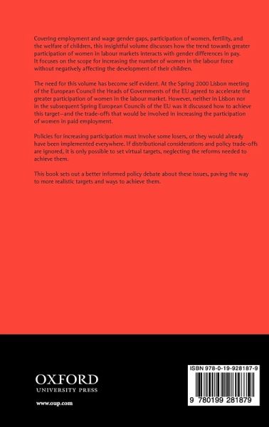 Covering employment and wage gender gaps, participation of women, fertility, and the welfare of children, this insightful volume discusses how the trend towards greater participation of women in labour markets interacts with gender differences in pay. It focusses on the scope for increasing the number of women in the labour force without negatively affecting the development of their children. The need for this volume has become self evident. At the Spring 2000 Lisbon meeting of the European Council the Heads of Governments of the EU agreed to accelerate the greater participation of women in the labour market. However, neither in Lisbon nor in the subsequent Spring European Councils of the EU was it discussed how to achieve this target - and the trade-offs that would be involved in increasing the participation of women in paid employment. Policies for increasing participation must involve some losers, or they would already have been implemented everywhere. If distributional considerations and policy trade-offs are ignored, it is only possible to set virtual targets, neglecting the reforms needed to achieve them. This book sets out a better informed policy debate about these issues, paving the way to more realistic targets and ways to achieve them.