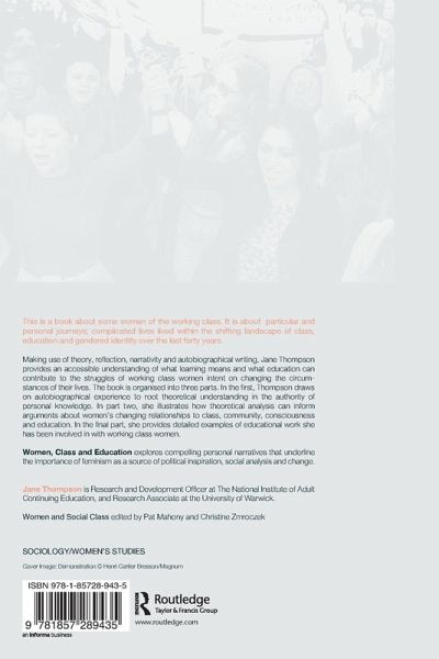 Making use of theory, reflection, narrativity and auto/biographical writing, Jane Thompson provides a comprehensive understanding of what learning really means, and what education can contribute to the struggles of working class women intent on changing the circumstances of their lives. Organized into three parts, in the first section, Thompson draws on autobiographical experience to root theoretical understanding in the authority of personal knowledge. In part two, she illustrates how theoretical analysis can inform arguments about women's changing relationships to class, community, consciousness and education. In the final part, she provides detailed examples of educational work she has been involved in with working class women. Containing vivid autobiographical narratives from women in England and Northern Ireland, Women, Class and Education explores compelling personal narratives that underline the importance of feminism as a source of political inspiration, social analysis and change.