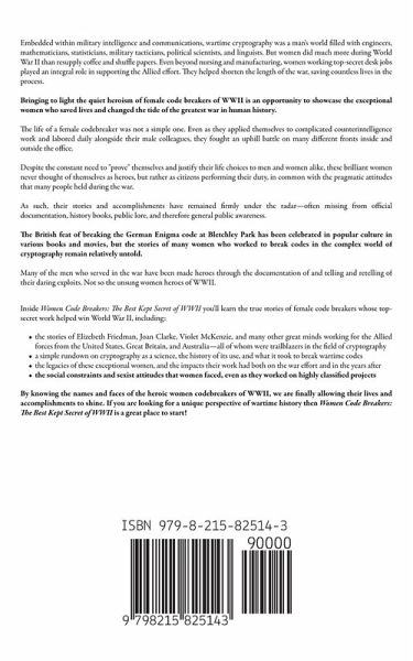 Embedded within military intelligence and communications, wartime cryptography was a man's world filled with engineers, mathematicians, statisticians, military tacticians, political scientists, and linguists. But women did much more during World War II than resupply coffee and shuffle papers. Women working top-secret desk jobs played an integral role in supporting the Allied effort. They helped shorten the length of the war, saving countless lives in the process. Bringing to light the quiet heroism of female code breakers of WWII is an opportunity to showcase the exceptional women who saved lives and changed the tide of the greatest war in human history. The life of a female codebreaker was not a simple one. Even as they applied themselves to complicated counterintelligence work and labored daily alongside their male colleagues, they fought an uphill battle on many different fronts inside and outside the office. Despite the constant need to "prove" themselves and justify their life choices to men and women alike, these brilliant women never thought of themselves as heroes, but rather as citizens performing their duty, in common with the pragmatic attitudes that many people held during the war. As such, their stories and accomplishments have remained firmly under the radar-often missing from official documentation, history books, public lore, and therefore general public awareness. The British feat of breaking the German Enigma code at Bletchley Park has been celebrated in popular culture in various books and movies, but the stories of many women who worked to break codes in the complex world of cryptography remain relatively untold. Inside Women Code Breakers: The Best Kept Secret of WWII you'll learn the true stories of female code breakers whose top-secret work helped win World War II, including:the stories of Elizebeth Friedman, Joan Clarke, Violet McKenzie, and many other great minds working for the Allied forces from the United States, Great Britain, and Australia-all of whom were trailblazers in the field of cryptography a simple rundown on cryptography as a science, the history of its use, and what it took to break wartime codes the legacies of these exceptional women, and the impacts their work had both on the war effort and in the years after the social constraints and sexist attitudes that women faced, even as they worked on highly classified projects By knowing the names and faces of the heroic women codebreakers of WWII, we are finally allowing their lives and accomplishments to shine. If you are looking for a unique perspective of wartime history then Women Code Breakers: The Best Kept Secret of WWII is a great place to start!