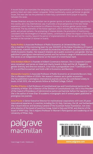 Women Directors analyzes the Italian law on gender quotas in boards as a vital opportunity for the country and a key international case. It provides a broad perspective of the new Italian experience, which has the potential of influencing the way of addressing gender issues worldwide.