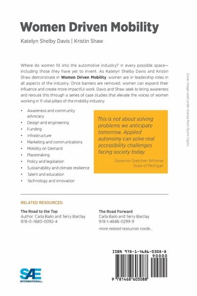 Where do women fit into the automotive industry? In every possible space-including those they have yet to invent! As Katelyn Shelby Davis and Kristin Shaw demonstrate in Women Driven Mobility, women are in leadership roles in all aspects of the industry. Davis and Shaw seek bring awareness and reroute this through a series of case studies that feature women working in 11 vital pillars of the mobility industry: This book presents over 40 case studies of women leading the way mobility and automotive innovation. Through interviews with leaders across the entire spectrum of industry, readers see the impact of diverse perspectives on actual projects all over the world. From creating accessible AV transportation with May Mobility to developing safe pedestrian and bike routes through Tribal Land, Karuk Tribe to championing diversity, equity and inclusion across the industries, readers are walked through each stage of the project from analysis to conclusion. Foreword by Governor Gretchen Whitmore, State of Michigan: This is not about solving problems we anticipate tomorrow. Applied autonomy can solve real accessibility challenges facing society today.