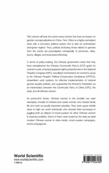 This volume will look into some macro factors that have an impact on gender conceptualizations in China. First, China is a highly-centralized state with a one-party political system that is also an authoritarian strongman regime. Thus, policies (including those related to gender) from the center are promulgated centripetally to provinces, cities, towns, villages, and local areas effectively. In terms of policy-making, the Chinese government noted that they have strengthened the Chinese Communist Party's (CCP) guide for women's work, enacted/upgraded rights protection law in the National People's Congress (NPC), actualized mechanisms for women's cause in the Chinese People's Political Conservative Conference (CPPCC), streamlined work systems for effective implementation of national gender equality policies, and augmented the Women's Federation as an intermediary between the Communist Party of China (CPC), the state, and all Chinese women. As productive forces, Chinese women in the socialist era were exemplary models of mothers and career women who treated family life and work as equally important priorities. They were upper middle class to high net worth individuals who showed their successes in juggling both as objects of moral suasion for other Chinese women in state-led publicity. Some of them were touted by the state as ideal modern Chinese women in state media, moral suasion campaigns, and/or propaganda.