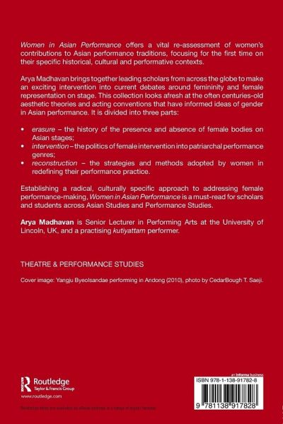 Women in Asian Performance offers a vital re-assessment of women's contributions to Asian performance traditions, focusing for the first time on their specific historical, cultural and performative contexts. Arya Madhavan brings together leading scholars from across the globe to make an exciting intervention into current debates around femininity and female representation on stage. This collection looks afresh at the often centuries-old aesthetic theories and acting conventions that have informed ideas of gender in Asian performance. It is divided into three parts: erasure - the history of the presence and absence of female bodies on Asian stages; intervention - the politics of female intervention into patriarchal performance genres; reconstruction - the strategies and methods adopted by women in redefining their performance practice. Establishing a radical, culturally specific approach to addressing female performance-making, Women in Asian Performance is a must-read for scholars and students across Asian Studies and Performance Studies.