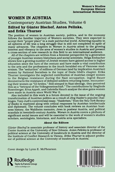 The position of women in Austrian society, politics, and in the economy follows the familiar trajectory of Western societies. They were expected to accept their "proper place" in a male patriarchal world. Achieving equality in all spheres of life was a long struggle that is still not completed in spite of many advances. The chapters in Women in Austria attest to the growing interest and vibrancy in the area of women's studies in Austria and present a cross-section of new research in this field to an international audience. The volume includes with book reviews on Austrian business history, the Waldheim memoirs, Jews in postwar Austria, and political scandals in twentieth-century Austria. Women in Austria covers a plethora of significant social issues and will be essential to the work of women's studies scholars, sociologists, historians, and Austrian area specialists.