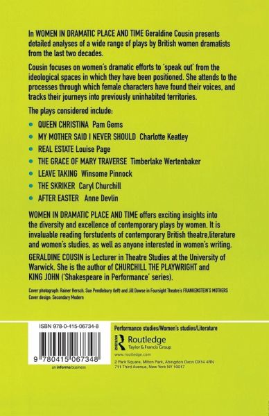 In this work, Geraldine Cousins presents detailed analyses of a wide range of plays by British women dramatists from the last two decades. The book takes as its central focus women's dramatic attempts to "speak out" of the ideological spaces in which they have been confined. It reveals the processes through which female characters have found their voices, and tracks their journeys into previously uninhabited territories. The plays considered include: "Queen Christina" by Pam Gem; "My Mother Said I Never Should" by Charlotte Keatley; "Real Estate" by Louise Page; "The Grace of Mary Traverse" by Timberlake Wertenbaker; "Leave Taking" by Winsome Pinnock; "The Striker" by Caryl Churchill; and "After Easter" by Anne Devlin.
