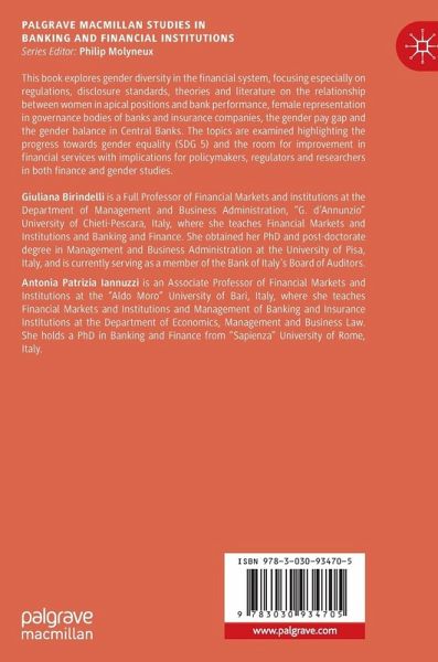 This book explores gender diversity in the financial system, focusing especially on regulations, disclosure standards, theories and literature on the relationship between women in atypical positions and bank performance, female representation in governance bodies of banks and insurance companies, the gender pay gap and the gender balance in Central Banks. The topics are examined highlighting the progress towards gender equality (SDG 5) and the room for improvement in financial services with implications for policymakers, regulators and researchers in both finance and gender studies.