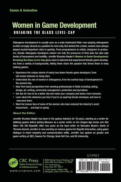 Videogame development is usually seen as a male dominated field; even playing videogames is often wrongly viewed as a pastime for men only. But behind the curtain, women have always played myriad important roles in gaming. From programmers to artists, designers to producers, female videogame developers endure not only the pressures of their jobs but also epic levels of harassment and hostility. Jennifer Brandes Hepler's Women in Game Development: Breaking the Glass Level-Cap gives voice to talented and experienced female game developers from a variety of backgrounds, letting them share the passion that drives them to keep making games.