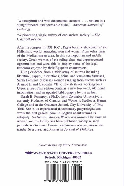 After its conquest in 331 B.C., Egypt became the center of the Hellenistic world, attracting men and women from other parts of the Mediterranean area. In this cosmopolitan and mobile society, Greek women of the ruling class had unprecedented opportunities and were able to employ some of the legal freedoms enjoyed by their Egyptian counterparts. Using evidence from a wide array of sources including literature, papyri, inscriptions, coins, and terra-cotta figurines, Sarah Pomeroy discusses women ranging from queens such as Arsinoë II and Cleopatra VII to Jewish slaves working on a Greek estate. This edition contains a new foreword, additional information, and an updated bibliography by the author.