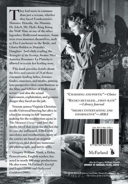 They had more in common than just a scream, whether they faced Dracula, Frankenstein's Monster, the Mummy, Dr. Jekyll, Mr. Hyde, King Kong, the Wolf Man, or any of the other legendary Hollywood monsters. Some were even monsters themselves, such as Elsa Lanchester as the Bride, and Gloria Holden as Dracula's Daughter. And while evading the Strangler of the Swamp, former Miss America Rosemary La Planche is allowed to rescue her leading man. This book provides details about the lives and careers of 21 of these cinematic leading ladies, femmes fatales, monsters, and misfits, putting into perspective their contributions to the films and folklore of Hollywood terror--and also the sexual harassment, exploitation, and genuine danger they faced on the job. Veteran actress Virginia Christine recalls Universal burying her alive in a backlot swamp in full ""mummy"" makeup for the resurrection scene in The Mummy's Curse--and how the studio saved that scene for the last day in case she suffocated. Filled with anecdotes and recollections, many of the entries are based on original interviews, and there are numerous old photographs and movie stills.