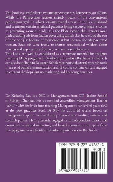 This book is classified into two major sections viz. Perspectives and Plots. While the Perspectives section majorly speaks of the conventional gender portrayals in advertisements over the years in India and abroad and mentions certain unethical practices being executed when it comes to presenting women in ads, it is the Plots section that extracts some path breaking ads from Indian advertising annals that have stood the test of time not just because of their content but the way the ads portrayed women. Such ads were found to shatter conventional wisdom about women and expectations from women in an exemplary way. This book can well be considered as a reference material for students pursuing MBA programs in Marketing at various B-schools in India. It can also be of help to Research Scholars pursuing doctoral research work in areas of brand communication and of course content writers engaged in content development on marketing and branding practices.