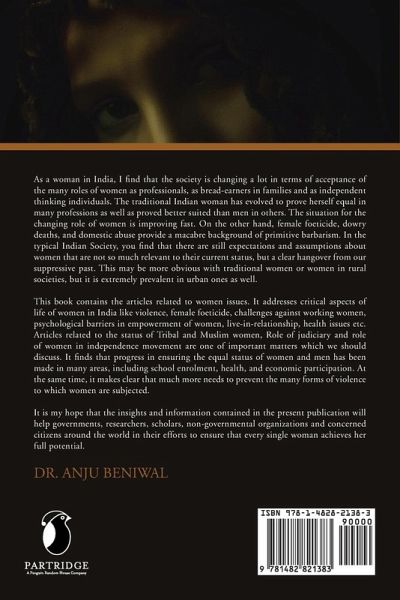 As a woman in India, I find that the society is changing a lot in terms of acceptance of the many roles of women as professionals, as bread-earners in families and as independent thinking individuals. The traditional Indian woman has evolved to prove herself equal in many professions as well as proved better suited than men in others. The situation for the changing role of women is improving fast. On the other hand, female foeticide, dowry deaths, and domestic abuse provide a macabre background of primitive barbarism. In the typical Indian Society, you find that there are still expectations and assumptions about women that are not so much relevant to their current status, but a clear hangover from our suppressive past. This may be more obvious with traditional women or women in rural societies, but it is extremely prevalent in urban ones as well. This book contains the articles related to women issues. It addresses critical aspects of life of women in India like violence, female foeticide, challenges against working women, psychological barriers in empowerment of women, live-in-relationship, health issues etc. Articles related to the status of Tribal and Muslim women, Role of judiciary and role of women in independence movement are one of important matters which we should discuss. It finds that progress in ensuring the equal status of women and men has been made in many areas, including school enrolment, health, and economic participation. At the same time, it makes clear that much more needs to prevent the many forms of violence to which women are subjected. It is my hope that the insights and information contained in the present publication will help governments, researchers, scholars, non-governmental organizations and concerned citizens around the world in their efforts to ensure that every single woman achieves her full potential.