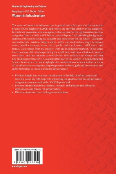 The status of America's infrastructure is graded every four years by the American Society of Civil Engineers (ASCE) and reports are provided on the various categories. In this book, prominent women engineers discuss many of the eighteen infrastructure categories from the 2021 ASCE Infrastructure Report Card providing background, analysis of the issues facing the category and projections for the future. Categories covered include aviation, bridges, dams, water and wastewater, energy, hazardous waste, inland waterways, levees, ports, public parks, rail, roads, solid waste, and transit. Case studies from the authors' work are included throughout. These topics touch on many of the challenges facing the world today and these solutions by women researchers and practitioners are valuable for their technical excellence and their non-traditional perspective. As an important part of the Women in Engineering and Science book series, the work highlights the contribution of women leaders in many of the infrastructure categories, inspiring women and men, girls and boys to enter and apply themselves to secure our future infrastructure.
