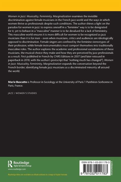 Women in Jazz: Musicality, Femininity, Marginalization examines the invisible discrimination against female musicians in the French jazz world and the ways in which women thrive as professionals despite such conditions. The author shines a light on the paradox for women in jazz: to express oneself in a "feminine" way is to be denigrated for it, yet to behave in a "masculine" manner is to be devalued for a lack of femininity. This masculine world ensures it is more difficult for women to be recognized as jazz musicians than it is for men - even when musicians, critics and audiences are ideologically opposed to discrimination. Female singers are confined by the feminine stereotypes of their profession, while female instrumentalists must comport themselves into traditionally masculine roles. The author explores the academic and professional socializations of these musicians, the musical choice they make and how they are perceived by jazz professionals as a result. First published in French by CNRS Editions in 2007 (and later reissued in paperback in 2018, with the author's postscript that "nothing much has changed"), Women in Jazz: Musicality, Femininity, Marginalization expands the conversation beyond the French border, identifying female jazz musicians as a discriminated minority all around the world.