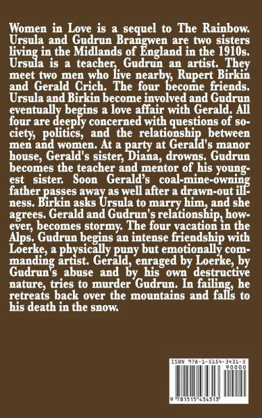 Women in Love is a sequel to The Rainbow. Ursula and Gudrun Brangwen are two sisters living in the Midlands of England in the 1910s. Ursula is a teacher, Gudrun an artist. They meet two men who live nearby, Rupert Birkin and Gerald Crich. The four become friends. Ursula and Birkin become involved and Gudrun eventually begins a love affair with Gerald. All four are deeply concerned with questions of society, politics, and the relationship between men and women.
