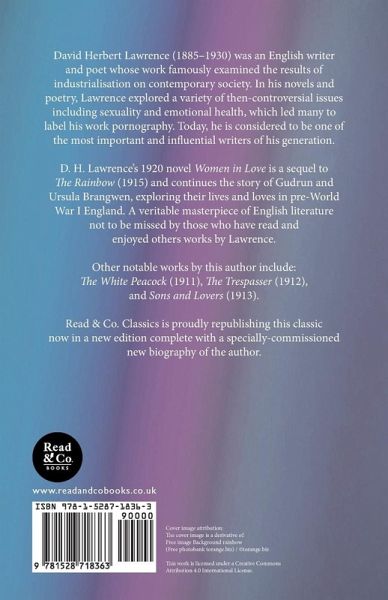 David Herbert Lawrence (1885-1930) was an English writer and poet whose work famously examined the results of industrialisation on contemporary society. In his novels and poetry, Lawrence explored a variety of then-controversial issues including sexuality and emotional health, which led many to label his work pornography. Today, he is considered to be one of the most important and influential writers of his generation. Lawrence's 1920 novel "Women in Love" is a sequel to "The Rainbow" (1915) and continues the story of Gudrun and Ursula Brangwen, exploring their lives and loves in pre-World War I England. A veritable masterpiece of English literature not to be missed by those who have read and enjoyed others works by Lawrence. Other notable works by this author include: "The White Peacock" (1911), "The Trespasser" (1912), and "Sons and Lovers" (1913). Read & Co. Classics is proudly republishing this classic now in a new edition complete with a specially-commissioned new biography of the author.
