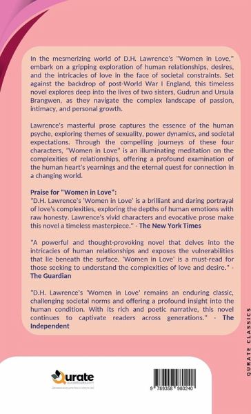 In the mesmerizing world of D.H. Lawrence's "Women in Love," embark on a gripping exploration of human relationships, desires, and the intricacies of love in the face of societal constraints. Set against the backdrop of post-World War I England, this timeless novel explores deep into the lives of two sisters, Gudrun and Ursula Brangwen, as they navigate the complex landscape of passion, intimacy, and personal growth. Lawrence's masterful prose captures the essence of the human psyche, exploring themes of sexuality, power dynamics, and societal expectations. Through the compelling journeys of these four characters, "Women in Love" is an illuminating meditation on the complexities of relationships, offering a profound examination of the human heart's yearnings and the eternal quest for connection in a changing world. Praise for "Women in Love": "D.H. Lawrence's 'Women in Love' is a brilliant and daring portrayal of love's complexities, exploring the depths of human emotions with raw honesty. Lawrence's vivid characters and evocative prose make this novel a timeless masterpiece." - The New York Times "A powerful and thought-provoking novel that delves into the intricacies of human relationships and exposes the vulnerabilities that lie beneath the surface. 'Women in Love' is a must-read for those seeking to understand the complexities of love and desire." - The Guardian "D.H. Lawrence's 'Women in Love' remains an enduring classic, challenging societal norms and offering a profound insight into the human condition. With its rich and poetic narrative, this novel continues to captivate readers across generations." - The Independent