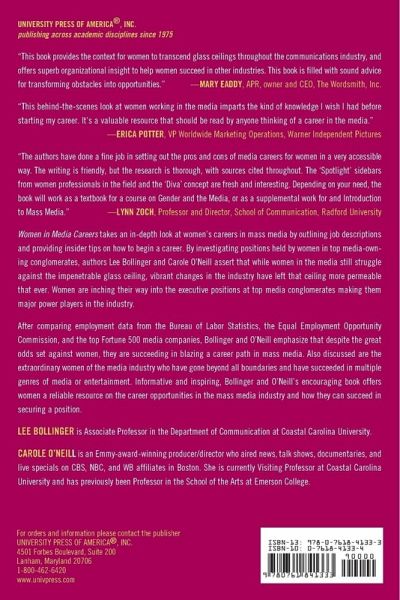 Women in Media Careers takes an in-depth look at women's careers in mass media by outlining job descriptions and providing insider tips on how to begin a career. By investigating positions held by women in top media-owning conglomerates, authors Lee Bollinger and Carole O'Neill assert that while women in the media still struggle against the impenetrable glass ceiling, vibrant changes in the industry have left that ceiling more permeable than ever. Women are inching their way into the executive positions at top media conglomerates making them major power players in the industry. After comparing employment data from the Bureau of Labor Statistics, the Equal Employment Opportunity Commission, and the top Fortune 500 media companies, Bollinger and O'Neill emphasize that despite the great odds set against women, they are succeeding in blazing a career path in mass media. Also discussed are the extraordinary women of the media industry who have gone beyond all boundaries and have succeeded in multiple genres of media or entertainment. Informative and inspiring, Bollinger and O'Neill's encouraging book offers women a reliable resource on the career opportunities in the mass media industry and how they can succeed in securing a position at the top.
