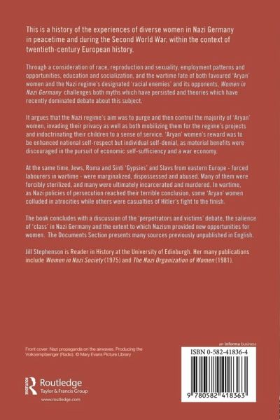 This is a history of the experiences of diverse women in Nazi Germany in peacetime and during the Second World War, within the context of twentieth century European history. Through a consideration of race, reproduction and sexuality, employment patterns and opportunities, education and socialization, and the wartime fate of both favoured 'Aryan' women and the Nazi regime's designated 'racial enemies' and its opponents, it challenges both myths which have persisted and theories which have recently dominated debate about this subject. It argues that the Nazi regime's aim was to purge and then control the majority of 'Aryan' women, invading their privacy as well as both mobilizing them for the regime's projects and indoctrinating their children to a sense of service. 'Aryan' women's reward was to be enhanced national self-respect but individual self-denial, as material benefits were discouraged in the pursuit of economic self-sufficiency and a war economy. At the same time, Jews, Roma and Sinti 'Gypsies' and Slavs from eastern Europe - forced labourers in wartime - were marginalized, dispossessed and abused. Many of them were forcibly sterilized, and many were ultimately incarcerated and murdered. In wartime, as Nazi policies of persecution reached their terrible conclusion, some 'Aryan' women colluded in atrocities while others were casualties of Hitler's fight to the finish. The book concludes with a discussion of the 'perpetrators and victims' debate, the salience of 'class' in Nazi Germany and the extent to which Nazism provided new opportunities for women. The Documents Section presents many sources previously unpublished in English. Jill Stephenson is Reader in History at the University of Edinburgh. Her many publications include `Women in Nazi Society¿ (1975) and `The Nazi Organization of Women¿ (1981).