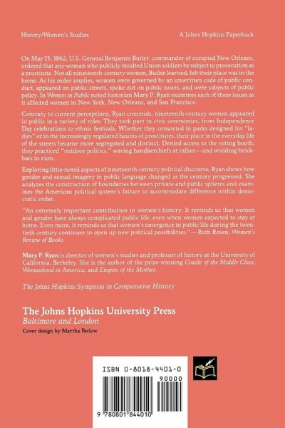 On May 15, 1862, U.S. General Benjamin Butler, commander of occupied New Orleans, ordered that any woman who publicly insulted Union soldiers be subject to prosecution as a prostitute. Not all nineteenth-century women, Butler learned, felt their place was in the home. As his order implies, women were governed by an unwritten code of public conduct, appeared on public streets, spoke out on public issues, and were subjects of public policy. In "Women in Public" noted historian Mary P. Ryan examines each of these issues as it affected women in New York, New Orleans, and San Francisco. Contrary to current perceptions, Ryan contends, nineteenth-century women appeared in public in a variety of roles. They took part in civic ceremonies, from Independence Day celebrations to ethnic festivals. Whether they sonsorted in parks designed for "ladies" or in the increasingly regulated haunts of prostitutes, their place in the everyday life of the streets became more segregated and distinct. Denied access to the voting booth, they practiced "outdoor politics," waving handkerchiefs at rallies--and wielding brickbats in riots. Exploring little-noted aspects of nineteenth-century political discourse, Ryan shows how gender and sexual imagery in public language changed as the century progressed. She analyzes the construction of boundaries between private and public spheres and examines the American political system's failure to accommodate difference within democratic order.