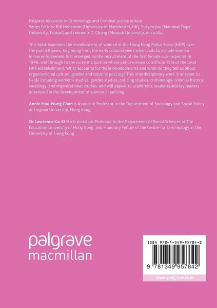 This book examines the development of women in the Hong Kong Police Force (HKP) over the past 68 years, beginning from the early colonial years when calls to include women in law enforcement first emerged, to the recruitment of the first female sub-inspector in 1949, and through to the current situation where policewomen constitute 15% of the total HKP establishment. What accounts for these developments and what do they tell us about organisational culture, gender and colonial policing? This interdisciplinary work is relevant to fields including women's studies, gender studies, policing studies, criminology, colonial history, sociology, and organisational studies, and will appeal to academics, students and lay readers interested in the development of women in policing.