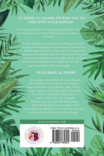 Is there a calling within you to step into your power? This book provides you with the inspiration, motivation and practical advice to show up as a leader and take your place in the world. So often ambitious women are held back from greater success because of limiting beliefs, fear and self doubt. Our dream is to shine the light on the path for these women. To inspire more women to overcome their doubts and truly step into their power as leaders by providing real-life role models and the inspiration and motivation to find their inner strength and take their place in the world as heart-centred leaders. Featuring Authors Amy Jackson, Anna Barwick, Dr Aparna Baruah, Allison Rahman, Clare Reilly, Dr Emma Barrett, Fiona Holmstrom, Georgia Graham, Helen Whait, Irina Castellano, Judy Cheung-Wood, Julie Okely, Karen Weaver, Lisa Walker, Megan Harrison, Captain Molly Fullee, Niti Nadarajah, Dr Olivia Ong, Peace Mitchell, Petina Tieman, Robina Savidis, Sarah Cremona, Sharon Collon, Sonia Marta, Stacey Barrass, Sue Stevenson, Dr Tanya Unni, Dr Vanessa Atienza-Hipolito, Wadzanai Nenzou