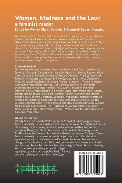 This book explores, for the first time in an edited collection, the intersection of three key research areas - women, madness and the law - and advances the debates on how law and the 'psy' sciences play a critical role in regulating and controlling women's lives.