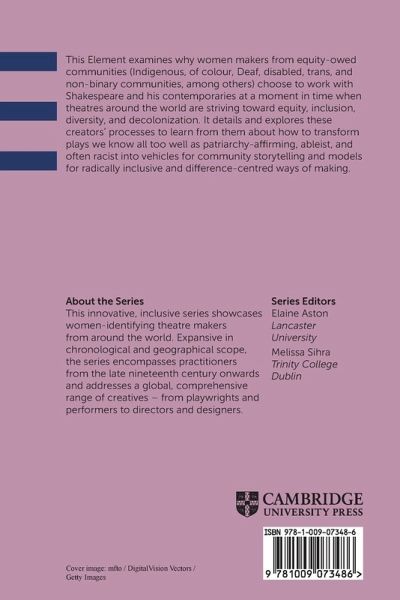 This Element examines why women makers from equity-owed communities (Indigenous, of colour, Deaf, disabled, trans and non-binary communities among others) choose to work with Shakespeare and his contemporaries at a moment in time when theatres around the world are striving toward equity, inclusion, diversity, and decolonization.