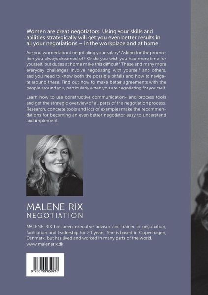 Women are great negotiators. Using your skills and abilities strategically will get you even better results in all your negotiations, in the workplace and at home Are you worried about negotiating your salary? Asking for the promotion you always dreamed of? Or do you wish you had more time for yourself, but duties at home make this difficult? These and many more everyday challenges involve negotiating with yourself and others, and you need to know both the possible pitfalls and how to navigate around these. Find out how to make better agreements with the people around you, particularly when you are negotiating for yourself. Learn how to use constructive communication- and process skills and get the strategic overview of all parts of the negotiation process. Research, concrete tools and lots of examples make the recommendations for becoming an even better negotiator easy to understand and implement