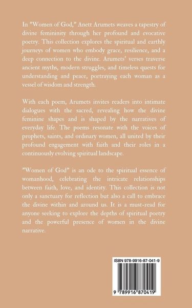 In "Women of God," Anett Arumets weaves a tapestry of divine femininity through her profound and evocative poetry. This collection explores the spiritual and earthly journeys of women who embody grace, resilience, and a deep connection to the divine. Arumets' verses traverse ancient myths, modern struggles, and timeless quests for understanding and peace, portraying each woman as a vessel of wisdom and strength. With each poem, Arumets invites readers into intimate dialogues with the sacred, revealing how the divine feminine shapes and is shaped by the narratives of everyday life. The poems resonate with the voices of prophets, saints, and ordinary women, all united by their profound engagement with faith and their roles in a continuously evolving spiritual landscape. "Women of God" is an ode to the spiritual essence of womanhood, celebrating the intricate relationships between faith, love, and identity. This collection is not only a sanctuary for reflection but also a call to embrace the divine within and around us. It is a must-read for anyone seeking to explore the depths of spiritual poetry and the powerful presence of women in the divine narrative. Copyright © 2024 Book Fairy Publishing