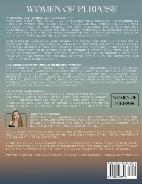 Inside Women of Purpose: Creating a Better World You'll uncover the extraordinary stories of women from diverse backgrounds who have confronted life's most daunting challenges and emerged not just unscathed, but with a resolute determination to make a positive impact. These women have transformed adversity into opportunity, pain into purpose, and dreams into reality-leaving a legacy of change that reverberates through their communities and beyond. With powerful narratives from women all around the world, this collection showcases the resilience, courage, and passion that drive women to break barriers and build a brighter future. Each chapter is a testimony to the indomitable spirit of women who refuse to be defined by their struggles, instead using them as fuel to ignite transformation. From entrepreneurs and activists to thought leaders and creatives, these women are not only creating better lives for themselves but inspiring others to do the same. Featuring chapters from 33 incredible women: Alana Corpuz, Alicia Pozsony, Aloma Loren, Ana Sneeringer, Athena Menelaou, Christine Knight, Claire Libré, Claudia Bruschke, Debra Ebel, Dr. Rani Thanacoody, Elizabeth Meigs, Erlendson Van Remmen, Hege Saksed, Jody Steinhauer, Julia Michasiewicz, K. Crystal Griffith, Katie Barnett, Keisha Bloise, Kellie Haehnel, Kimberly Clement, Linda Thuy Le, Micaela El Fattal, Michelle Padgett, Rebecca Engle, Robbie Motter, Sam Ballington, Sherine Brown, Shyla Day, Sonia Rodrigues, Soochen Low, Suzy Rawlins, Tina K Kailea, and Tracie Everett.