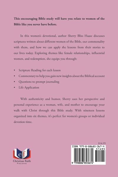This encouraging Bible study will have you relate to women of the Bible like you never have before. In this women's devotional, author Sherry Bliss Haase discusses scriptures written about different women of the Bible, our commonality with them, and how we can apply the lessons from their stories to our lives today. Exploring themes like female relationships, influential women, and redemption, she equips you through: Scripture Reading for each lesson Commentary to help you gain new insights about the Biblical account Questions to prompt journaling Life Application With authenticity and humor, Sherry uses her perspective and personal experience as a woman, wife, and mother to encourage your walk with Christ through this Bible study. With nineteen lessons organized into six themes, it's perfect for women's groups or individual devotion time.