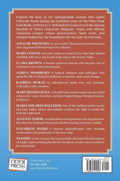 Explore the lives of ten unforgettable women who called Colorado home during the turbulent years of the Pikes Peak Gold Rush. Authors J.v.L. Bell and Jan Gunia reveal the unsung heroism of Native American, Hispanic, Anglo, and African American women whose perseverance, hard work, and wisdom helped lay the foundation for the state of Colorado. AMACHE PROWERS: A successful Cheyenne businesswoman who negotiated life between two cultures. MARY COZENS: An early settler in Central City who later helped establish and run a ranch and stage stop in the Fraser Valley. CLARA BROWN:A former enslaved woman who became one of Colorado's most beloved pioneers. ALBINA WASHBURN: A radical reformer and suffragist who spent her life working for political, economic, and social change. KATRINA MURAT: An adventurous spirit who was, perhaps, Colorado's only countess. MARY MELISSA HALL: A South Park ranchwoman who provided a haven for weary travelers and later helped bring Christian Science to Denver. MARIA DOLORES BALLEJOS: One of the earliest settlers in the San Luis Valley whose descendants continue the fight to retain the land she cultivated. AUGUSTA TABOR: An industrious entrepreneur who forged a new life after her husband's betrayal and the ensuing national scandal. ELIZABETH BYERS: A Denver philanthropist who brought compassion and generosity to her new state. TSASHIN: A Ute woman who successfully advocated for the release of Anglo captives during the Meeker Incident, yet she was forced from her homeland.