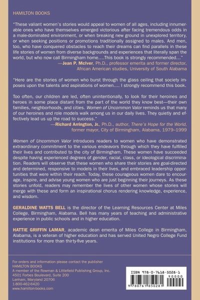 Women of Uncommon Valor introduces readers to women who have demonstrated extraordinary commitment to the various endeavors through which they have fulfilled their lives and contributed to the city of Birmingham. These women have succeeded despite having experienced degrees of gender, racial, class or ideological discrimination. Readers will observe that these women who share their stories are goal-directed and determined, responsive to models in their lives, and embraced leadership opportunities that were within their reach. Today, these courageous women dare to encourage, inspire, and advise young women who are just beginning their journeys. As these stories unfold, readers may remember the lives of other women whose stories will merge with these and form an inspirational chorus rendering knowledge, experience, and wisdom.
