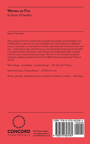 p>Monologues Characters: 1-12female Unit set This evening of twelve emotionally charged monologues starred Judith Ivey Off Broadway, where its run was extended twice. From ad exec to Midwest mom to care-giver to construction worker, each character is on fire in her own way - with passion, fear, self-discovery, even shopping! Exploring the breadth of women's issues with humor and wisdom, the monologues offer excellent roles for one or more mature actresses. Wom