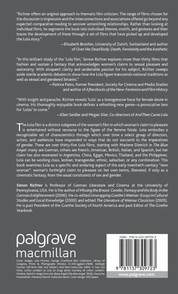 "In this brilliant study of the 'Lola film,' Simon Richter explores more than thirty films that fashion and sustain a fantasy that acknowledges women's legitimate claims to sexual pleasure and autonomy. With eloquent clarity and undeniable passion for his subject, Richter sweeps aside sterile academic debates to show how the Lola figure transcends national traditions - there are Lola films in German, US, Chinese, Mexican, Argentinean, and Egyptian cinema - as well as sexual and gendered binaries" - Patrice Petro, former President, Society for Cinema and Media Studies, author of Aftershocks of the New: Feminism and Film History