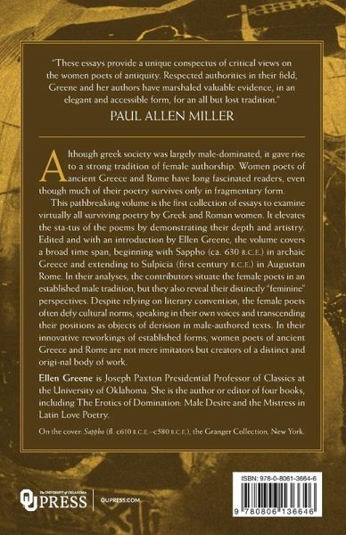 Although Greek society was largely male-dominated, it gave rise to a strong tradition of female authorship. Women poets of ancient Greece and Rome have long fascinated readers, even though much of their poetry survives only in fragmentary form. This pathbreaking volume is the first collection of essays to examine virtually all surviving poetry by Greek and Roman women. It elevates the status of the poems by demonstrating their depth and artistry. Edited and with an introduction by Ellen Greene, the volume covers a broad time span, beginning with Sappho (ca. 630 b.c.e.) in archaic Greece and extending to Sulpicia (first century B.C.E.) in Augustan Rome. In their analyses, the contributors situate the female poets in an established male tradition, but they also reveal their distinctly "feminine" perspectives. Despite relying on literary convention, the female poets often defy cultural norms, speaking in their own voices and transcending their positions as objects of derision in male-authored texts. In their innovative reworkings of established forms, women poets of ancient Greece and Rome are not mere imitators but creators of a distinct and original body of work.