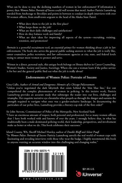 What can be done to stop the declining numbers of women in law enforcement? If information is power, then Women Police: Portraits of Success could well reverse that trend. Author Patricia Lunneborg traveled from Anchorage to Brooklyn and points in between to conduct in-depth interviews with over 50 women officers, from small-town sergeant to the head of the Alaska State Patrol. What drew them to the job in the first place? What keeps them on the job? What are their daily challenges and satisfactions? How do they balance work and family? What are their ideas for improving all aspects of the system--recruiting, training, retention, and promotion? Portraits is a powerful recruitment tool, an essential primer for women thinking about a job in law enforcement. The book also serves the general public seeking answers to what the job is really like, career counselors, police recruiters, and law enforcement agencies at city, state, and federal levels trying to attract more women to protect and serve. Written in a direct, personal style, this unique book belongs on library shelves in Career Counseling, Women's Studies, Society and Justice, Sociology. Where else can a woman learn if the police service is for her and the general public find out what the job is really about?