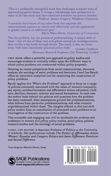 This is a profoundly thoughtful book that challenges accepted ways of approaching policy issues. It brings a refreshingly new perspective to some of the key areas that have exercised feminists for several decades' -Jeanne Gregory, Middlesex UniversityThis book offers a powerful new approach to policy studies. Drawing on recent perspectives from social constructionism, discourse analysis, the sociology of social problems and feminism, Carol Bacchi develops a step-by-step analytical tool for deconstructing policy problems.