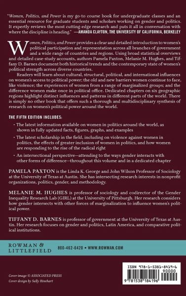 Women, Politics, and Power provides a clear and detailed introduction to women's political participation and representation across all branches of government and a wide range of countries and regions. Using broad statistical overviews and detailed case-study accounts, authors Pamela Paxton, Melanie M. Hughes, and Tiffany D. Barnes document both historical trends and the contemporary state of women's political strength across diverse countries. The text considers experiences of women from a range of marginalized groups, including racial, ethnic, and religious minorities; indigenous peoples; and those that face discrimination based on their sexual orientation and gender identity. Readers will learn about cultural, structural, political, and international influences on women's access to political power, about the old and new barriers women continue to face like violence, and about the difference women make once in political office. Dedicated chapters on six geographic regions highlight distinct influences and patterns in different parts of the world. There is simply no other book that offers such a thorough and multidisciplinary synthesis of research on women's political power around the world. The fifth edition includes the latest information available on women in politics around the world, including current events as they have unfolded across the globe. The newest thinking in the field is presented, including on violence against women in politics and intersectional approaches.