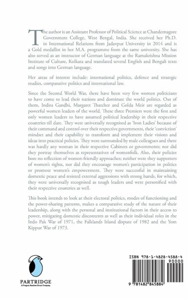 The author is an Assistant Professor of Political Science at Chandernagore Government College, West Bengal, India. She received her Ph.D. in International Relations from Jadavpur University in 2014 and is a Gold medallist in her M.A. programme from the same university. She has also served as an instructor of German language at the Ramakrishna Mission Institute of Culture, Kolkata and translated several English and Bengali texts and songs into German language. Her areas of interest include: international politics, defence and strategic studies, comparative politics and international law. Since the Second World War, there have been very few women politicians to have come to lead their nations and dominate the world politics. Out of them, Indira Gandhi, Margaret Thatcher and Golda Meir are regarded as powerful women leaders of the world. These three Premiers were the first and only women leaders to have assumed political leadership in their respective countries till date. They were universally recognised as 'Iron Ladies' because of their command and control over their respective governments, their 'conviction' mindset and their capability to transform and implement their visions and ideas into practical policies. They were surrounded by male colleagues and there was hardly any woman in their respective Cabinets or governments; nor did they portray themselves as representatives of womenfolk. Also, their policies bore no reflection of women-friendly approaches; neither were they supporters of women's rights, nor did they encourage women's participation in politics or promote women's empowerment. They were successful in maintaining domestic peace and resisted external aggressions with strong hands, for which, they were universally recognised as tough leaders and were personified with their respective countries as well. This book intends to look at their electoral politics, modes of functioning and the power-sharing patterns, makes a comparative study of the nature of their leadership, along with the personal and institutional factors in their access to power, mitigating domestic discontents as well as their individual roles in the Indo Pak War of 1971, the Falklands Island dispute of 1982 and the Yom Kippur War of 1973.