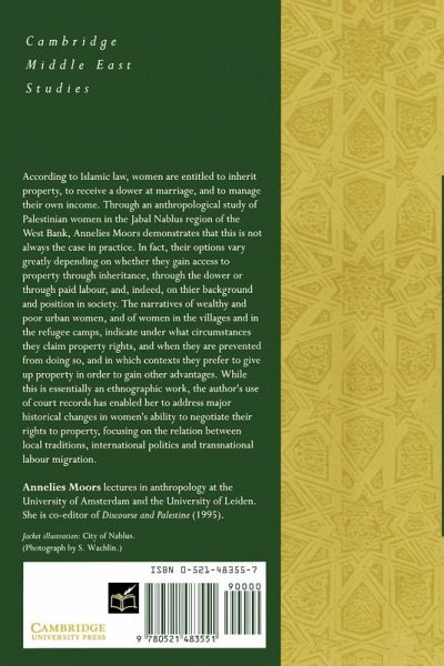 According to Islamic law, women are entitled to inherit property, to receive a dower at marriage, and to manage their own income. Through an anthropological study of Palestinian women in the Jabal Nablus region of the West Bank, Annelies Moors demonstrates that this is not always the case in practice. In fact, their options vary greatly depending on whether they gain access to property through inheritance, through the dower or through paid labour, and, indeed, on their background and position in society. The narratives of wealthy and poor urban women, and of women in the villages and in the refugee camps, indicate under what circumstances they claim property rights, and when they are prevented from doing so, and in which contexts they prefer to give up property in order to gain other advantages. While this is essentially an ethnographic work, the author's use of court records has enabled her to address major historical changes in women's ability to negotiate their rights to properly, focusing on the relation between local traditions, international politics and transnational labour migration.