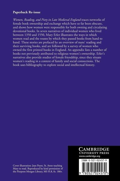 Women, Reading, and Piety in Late Medieval England traces networks of female book ownership and exchange which have so far been obscure, and shows how women were responsible for both owning and circulating devotional books. In seven narratives of individual women who lived between 1350 and 1550, Mary Erler illustrates the ways in which women read and the routes by which they passed books from hand to hand. These stories are prefaced by an overview of nuns' reading and their surviving books, and are followed by a survey of women who owned the first printed books in England. An appendix lists a number of books not previously attributed to religious women's ownership. Erler's narratives also provide studies of female friendship, since they situate women's reading in a network of family and social connections. The book uses bibliography to explore social and intellectual history.