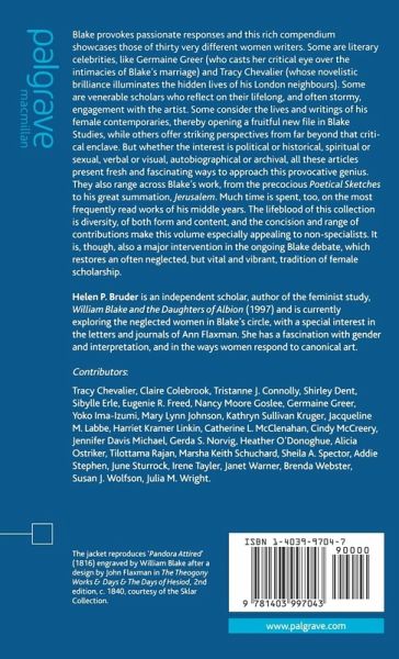 List of Illustrations List of Abbreviations Notes on Contributors Introductory Note; H.P.Bruder The Bread of sweet Thought & the Wine of Delight': Gender, Aesthetics and Blake's 'dear friend of Mrs Anna Flaxman'; H.P.Bruder Peeking over the Garden Wall; T.Chevalier Blake, Literary History and Sexual Difference; C.Colebrook Transgender Juvenilia: Blake's and Cristall's Poetical Sketches ; T.J. Connolly 'The right stuff in the right hands': Anna Gilchrist and The Life of William Blake ; S.Dent William Blake's Lavaterian Women: Eleanor, Rowena, and Ahania; S.Erle Blake's Golden Chapel: The Serpent Within and Those Who Stood Without; E.R.Freed How To Nearly Wreck Your Life by Living Blake; A. Stephen Aesthetic Agency? Enitharmon in Blake's Europe ; N.M.Goslee 'No Earthly Parents I confess': The Clod, the Pebble and Catherine Blake; G.Greer The Impact of Feminism on Blake Studies in Japan; Y.Ima-Izumi Mary and Martha on the Mount of Olives: Questions Toward a Commentary on Blake's Watercolour Illustrations of the Gospels; M.L.Johnson The Trimurti Meet the Zoas: 'Hindoo' Strategies in the Poetry of William Blake; K.S.Kruger Towards an Ungendered Romanticism: Blake, Robinson and Smith in 1793; J.M.Labbe William Blake and Romantic Women Poets: 'Then what have I to do with thee?'; H.K.Linkin 'Endless Their Labour': Women in Blake's Illuminated Works and the British Workforce; C.L.McClenahan Sentiment, Motherhood and the Sea in Gillray and Blake: C.McCreery Framing Eve: Reading Blake's Illustrations; J.D.Michael Lucid Dreaming/ Lucid Reading: Notes on Sleepers in Blake's Songs ; G.S. Norvig Valkyries and Sibyls: Old Norse Voices of Female Authority in Blake's Prophetic Books; H.O'Donoghue Re-Deeming Scripture: My William Blake Revisited; A.Ostriker The Gender of Los(s): Blake's Work in the 1790s; T.Rajan The 'Secret' and the 'Gift': Recovering the Suppressed Religious Heritage of William Blake and Hilda Dolittle; M.K.Schuchard A Kabbalistic Reading of Jerusalem 's Prose Plates; S.A.Spector Britania counter Britannia: How Jerusalem Revises Patriotism; J.Sturrock Blake: Sex and Selfhood; I.Tayler Blake Moments; J.Warner Blake, Sex and Women, Revisited; B.Webster The Strange Difference of Female 'Experience'; S.J.Wolfson Baillie and Blake: At the Intersection of Allegory and Drama; J.M.Wright Index
