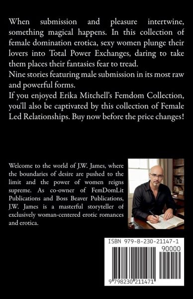Welcome to the world of J.W. James, where the boundaries of desire are pushed to the limit and the power of women reigns supreme. As co-owner of FemDomLit Publications and Boss Beaver Publications, J.W. James is a masterful storyteller of exclusively woman-centered erotic romances and erotica. The Visionary J.W. James is a passionate advocate for relationships where women hold the reins of control and men are happy to obey. His writing is a testament to the beauty of submission, where the pleasure of the woman is the ultimate goal. With each carefully crafted sentence, J.W. James weaves a web of seduction, surrender, and unbridled passion. The Author's Voice J.W. James's writing style is a perfect blend of romance and eroticism, with a deep understanding of the intricacies of human desire. His words are laced with a sense of reverence, adoration, and submission, creating a world where women are worshipped and men are eager to please. **The Niche** J.W. James's work is centered around the themes of BDSM, cuckoldry, femdom, body worship/ownership, and pegging. His stories are designed to normalize relationships where women are in control, and men are happy to surrender to their desires. The Promise In J.W. James's world, you can expect to be transported to a place of unbridled passion, where the boundaries of desire are pushed to the limit. His writing is a promise of surrender, submission, and ultimate pleasure. So, come and immerse yourself in the world of J.W. James, where the power of women reigns supreme. Get Ready to Surrender Follow J.W. James on Twitter/X @ErosbyJWJames and stay updated on his latest releases, behind-the-scenes insights, and exclusive content. Be prepared to surrender to the pleasure of the woman, and discover a world where desire knows no bounds.